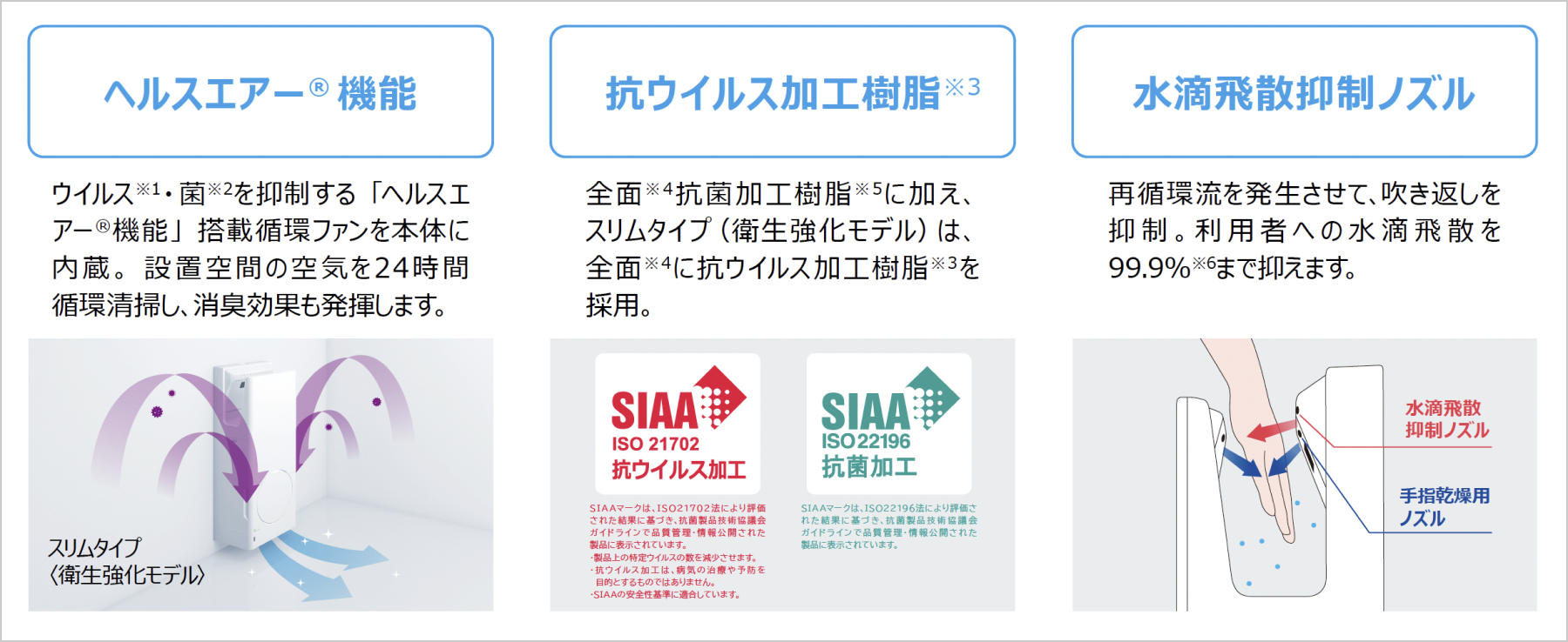 業界初※1!設置空間の空気を循環清浄する「ヘルスエアー®機能」搭載循環ファンを本体に組み込み、ウイルス※2・菌※3を抑制さらに、二段ノズル構造により利用者の水滴飛散を抑制置
